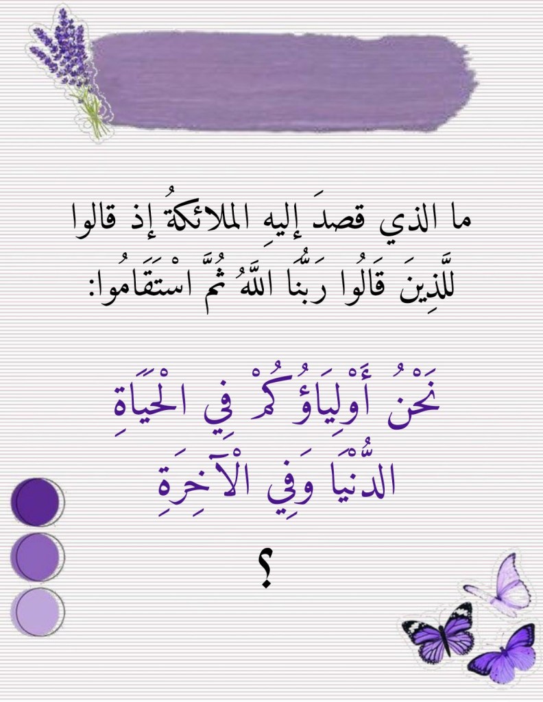 نقرأُ في سورةِ فُصِّلت، وفي الآيتَين الكريمتَين 30- 31 منها، قولَه تعالى: (إِنَّ الَّذِينَ قَالُوا رَبُّنَا اللَّهُ ثُمَّ اسْتَقَامُوا تَتَنَزَّلُ عَلَيْهِمُ الْمَلَائِكَةُ أَلَّا تَخَافُوا وَلَا تَحْزَنُوا وَأَبْشِرُوا بِالْجَنَّةِ الَّتِي كُنْتُمْ تُوعَدُونَ. نَحْنُ أَوْلِيَاؤُكُمْ فِي الْحَيَاةِ الدُّنْيَا وَفِي الْآخِرَةِ). فما الذي قصد إليه الملائكةُ إذ قالوا للذين قالوا رَبُّنَا اللَّهُ ثُمَّ اسْتَقَامُوا: “نَحْنُ أَوْلِيَاؤُكُمْ فِي الْحَيَاةِ الدُّنْيَا وَفِي الْآخِرَةِ”؟