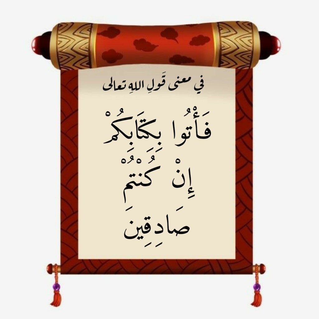 نقرأُ في سورةِ الصافات، وفي الآيتَين الكريمتَين 156- 157 منها، قولَه تعالى: (أَمْ لَكُمْ سُلْطَانٌ مُبِينٌ. فَأْتُوا بِكِتَابِكُمْ إِنْ كُنْتُمْ صَادِقِينَ). فما معنى “فَأْتُوا بِكِتَابِكُمْ إِنْ كُنْتُمْ صَادِقِينَ”؟