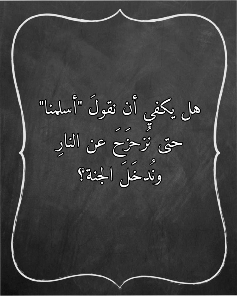 وهذا إن دلَّ فإنَّما يدلُّ على أنَّ مَن أشاعَ فينا هذه الفِريةَ لم يتدبَّر القرآنَ ولم يقدِر اللهَ حقَّ قدرِه! فكيف يتجاسرُ أحدٌ على قرآنِ الله، فيُشيعُ في الناسِ هذه الفِريةَ التي تتعارضُ، بالتمامِ والكلية، مع قولِ اللهِ تعالى (قَالَتِ الْأَعْرَابُ آمَنَّا قُلْ لَمْ تُؤْمِنُوا وَلَكِنْ قُولُوا أَسْلَمْنَا وَلَمَّا يَدْخُلِ الْإِيمَانُ فِي قُلُوبِكُمْ) (من 14 الحجرات). فلو كان قولُ “أسلمنا” كافٍ حقاً ليُزحزِحَ واحدَنا عن النارِ ويُدخِلَه الجنة، فلماذا إذاً شدَّدَ اللهُ تعالى على وجوبِ ألا نكتفيَ بهذا القول، وعلى أن نعملَ جاهدين حتى نرتقيَ بحالِنا مع اللهِ تعالى لنصبحَ مؤهَّلين لأن يدخلَ الإيمانُ في قلوبِنا؟!