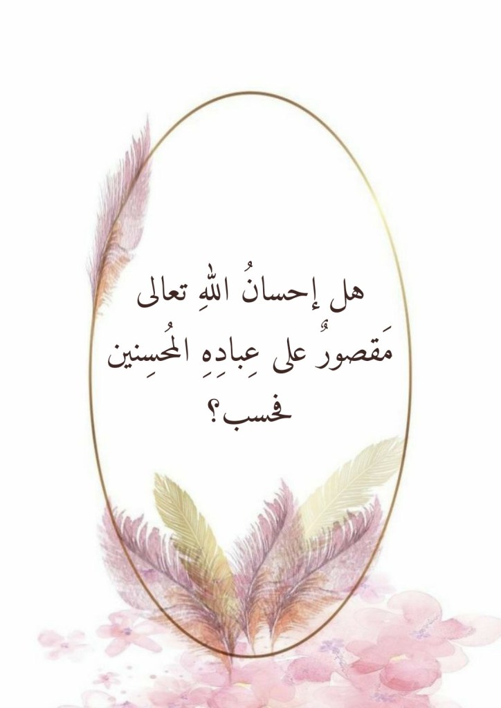 قد يُسارِعُ البعضُ إلى الجزمِ بأنَّ إحسانَ اللهِ لن يطالَ من عبادِ الله إلا المُحسنين! وما ذلك إلا بسببٍ من قراءةٍ غيرِ متدبِّرةٍ لقَولِ اللهِ تعالى: (هَلْ جَزَاءُ الْإِحْسَانِ إِلَّا الْإِحْسَانُ) (60 الرحمن). فتدبُّرُ هذه الآيةِ الكريمةِ كفيلٌ بأن يُبيِّنَ لنا أنَّ اللهَ تعالى لم يجعل إحسانَه مشروطاً بإحسانِ العبد، بينما جعلَ جزاءَ إحسانِ العبدِ هو الإحسانُ من جانبِه.