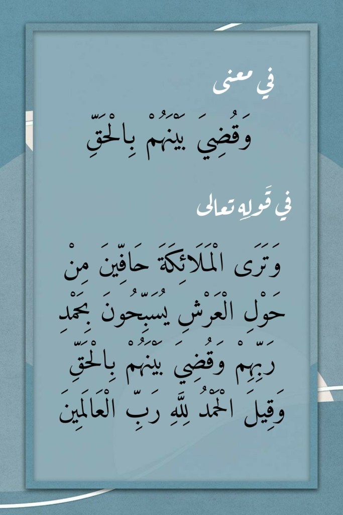 جوان 17, 2022 Sufism24/7 في معنى “وَقُضِيَ بَيْنَهُمْ بِالْحَقِّ” في قَولِهِ تعالى “وَتَرَى الْمَلَائِكَةَ حَافِّينَ مِنْ حَوْلِ الْعَرْشِ يُسَبِّحُونَ بِحَمْدِ رَبِّهِمْ وَقُضِيَ بَيْنَهُمْ بِالْحَقِّ وَقِيلَ الْحَمْدُ لِلَّهِ رَبِّ الْعَالَمِينَ” شارك هذا الموضوع: النقر للمشاركة على X (فتح في نافذة جديدة) X انقر للمشاركة على فيسبوك (فتح في نافذة جديدة) فيس بوك إعجاب تحميل... مرتبط