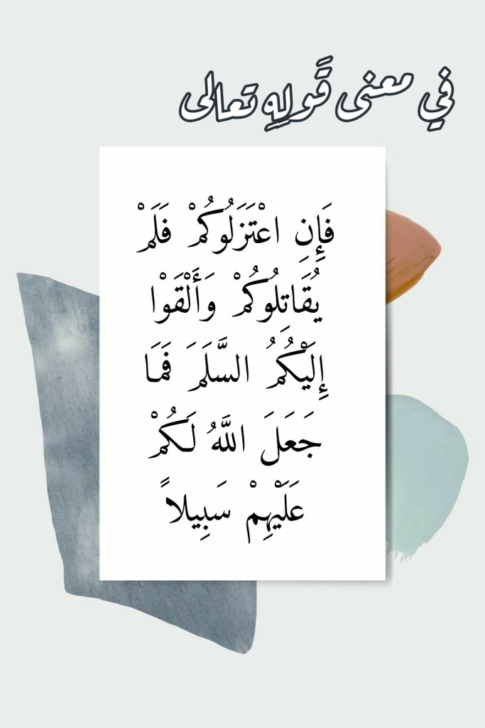 وبذلك تسقطُ كلُّ حُجَجِ المتطرفين المتزمتين الذين يريدونها حرباً شعواءَ تأتي على الأخضرِ واليابس! فالقرآنُ العظيم يُفنِّدُ زعمَ القائلين بأنَّ “الحربَ لن تنطفئَ نارُها حتى تقومَ الساعةُ طالما بقيَ هنالك مَن لم تصل إليه سيوفُهم ولم يرضَ بشروطِهم”! فلو صحَّ زعمُ هؤلاءِ الغُلاةِ العتاولة، لما قرأنا في القرآنِ العظيم قولَ اللهِ تعالى: (فَإِنِ اعْتَزَلُوكُمْ فَلَمْ يُقَاتِلُوكُمْ وَأَلْقَوْا إِلَيْكُمُ السَّلَمَ فَمَا جَعَلَ اللَّهُ لَكُمْ عَلَيْهِمْ سَبِيلًا) (من 90 النساء).