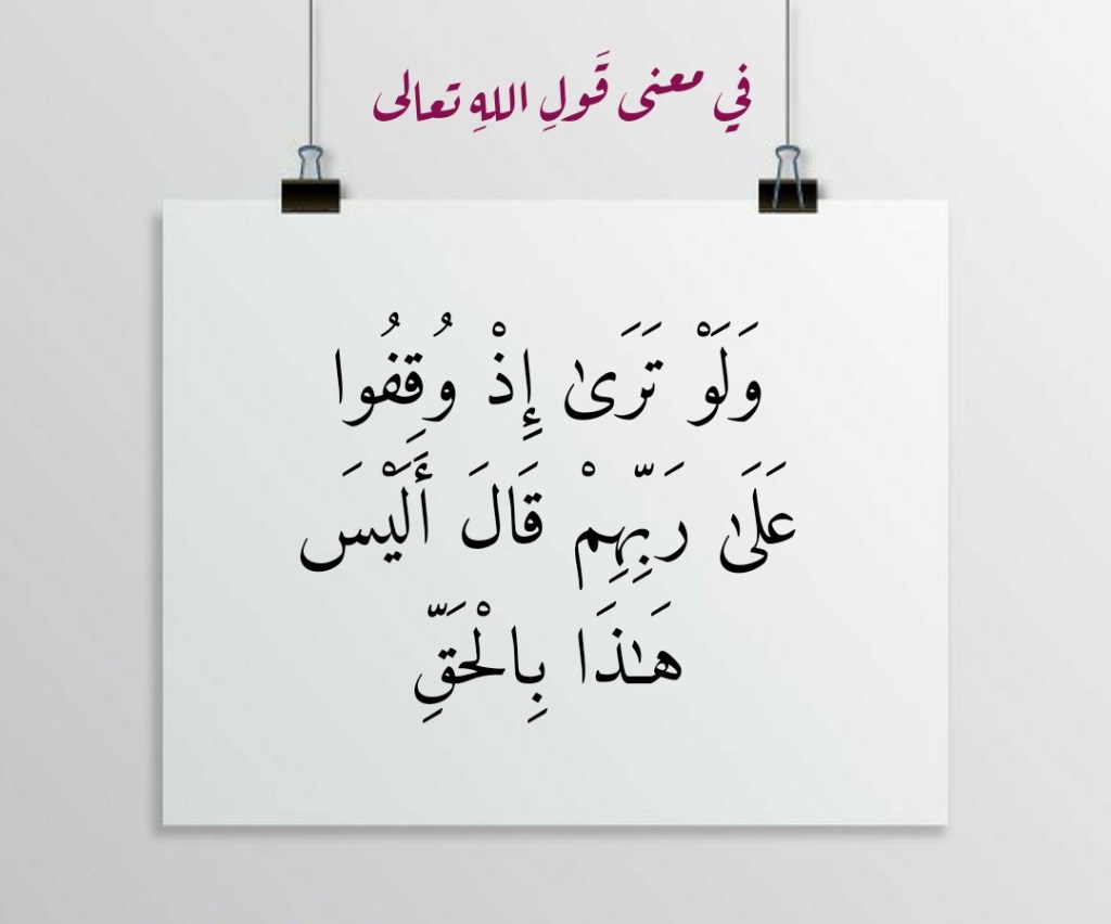 نقرأُ في سورةِ الأنعام، وفي الآيةِ الكريمة 30 منها، قَولَ اللهِ تعالى (وَلَوْ تَرَى إِذْ وُقِفُوا عَلَى رَبِّهِمْ قَالَ أَلَيْسَ هَذَا بِالْحَقِّ قَالُوا بَلَى وَرَبِّنَا قَالَ فَذُوقُوا الْعَذَابَ بِمَا كُنْتُمْ تَكْفُرُونَ). فما الذي يتعيَّنُ علينا أن نفهمَه من قولِه تعالى “وَلَوْ تَرَى إِذْ وُقِفُوا عَلَى رَبِّهِمْ”؟