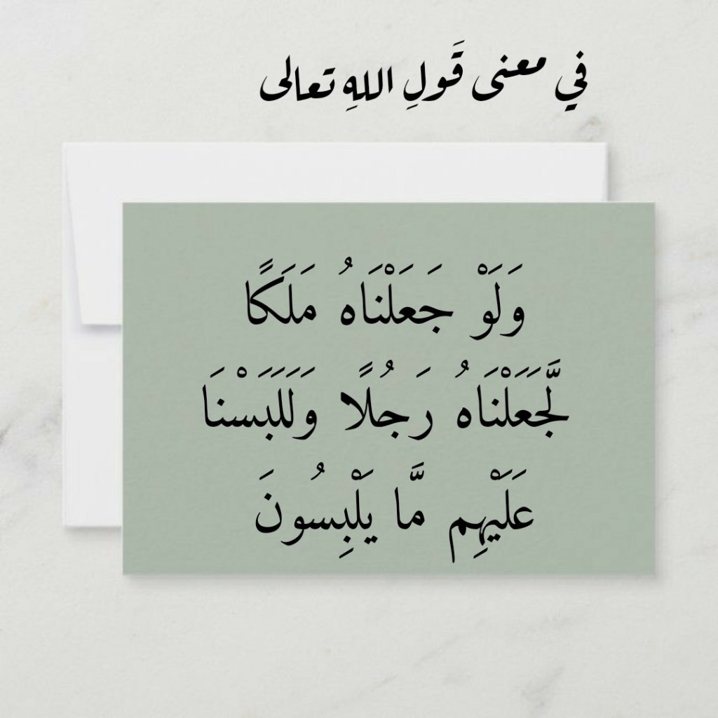 ولقد فاتَ كثيراً من المفسرين، من الذين تصدَّوا لتفسيرِ هذه الآية الكريمة (وَلَوْ جَعَلْنَاهُ مَلَكًا لَجَعَلْنَاهُ رَجُلًا وَلَلَبَسْنَا عَلَيْهِمْ مَا يَلْبِسُونَ)، أن يتبيَّنوا أنَّ اللهَ تعالى ذكرَ “الملَكَ” و”الملائكة” في هذه الآية الكريمة. فالعبارةُ القرآنيةُ “وَلَلَبَسْنَا عَلَيْهِمْ مَا يَلْبِسُونَ” تعني “لجعلنا الملائكةَ يلبسون ما تلبسونَ من الملابسِ والثياب”. وهذا أسلوبٌ قرآنيٌّ يتمايزُ به لسانُ القرآنِ العربي المبين عن لسانِنا الذي قرأنا به هذه الآيةَ الكريمة. لنتدبَّر مثلاً قولَ اللهِ تعالى: (فَمَنْ آمَنَ وَأَصْلَحَ فَلَا خَوْفٌ عَلَيْهِمْ وَلَا هُمْ يَحْزَنُون) (من 48 الأنعام).
