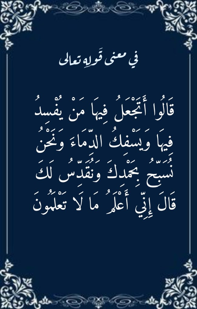 جويلية 30, 2022 Sufism24/7 في معنى قَولِهِ تعالى “قَالُوا أَتَجْعَلُ فِيهَا مَنْ يُفْسِدُ فِيهَا وَيَسْفِكُ الدِّمَاءَ وَنَحْنُ نُسَبِّحُ بِحَمْدِكَ وَنُقَدِّسُ لَكَ قَالَ إِنِّي أَعْلَمُ مَا لَا تَعْلَمُونَ” شارك هذا الموضوع: النقر للمشاركة على X (فتح في نافذة جديدة) X انقر للمشاركة على فيسبوك (فتح في نافذة جديدة) فيس بوك إعجاب تحميل... مرتبط