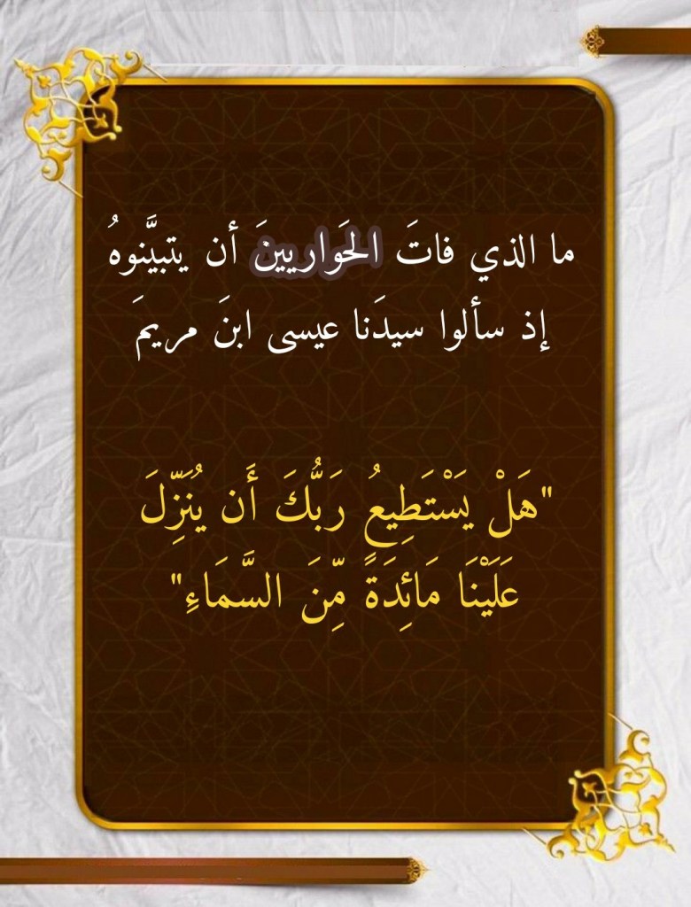سألَ الحواريون سيدَنا عيسى ابنَ مريمَ إن كانَ اللهُ تعالى بمقدورِهِ أن يُنزِّلَ عليهم مائدةً من الجنة: (إِذْ قَالَ الْحَوَارِيُّونَ يَا عِيسَى ابْنَ مَرْيَمَ هَلْ يَسْتَطِيعُ رَبُّكَ أَنْ يُنَزِّلَ عَلَيْنَا مَائِدَةً مِنَ السَّمَاءِ قَالَ اتَّقُوا اللَّهَ إِنْ كُنْتُمْ مُؤْمِنِينَ) (112 المائدة). وإنَّ المرءَ لَيعجبُ كيف فاتَ الحواريينَ أنَّ اللهَ تعالى، الذي خلقَ سيدَنا عيسى بأن قالَ له “كن فيكون”، قادرٌ على أن يفعلَ ما يشاء ومن ذلك أن يُنزِّلَ عليهم مائدةً من الجنة (أي من السماء).
