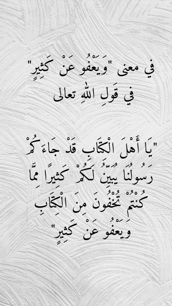 نقرأُ في سورةِ المائدة، وفي الآيةِ الكريمة 15 منها، قولَ اللهِ تعالى (يَا أَهْلَ الْكِتَابِ قَدْ جَاءَكُمْ رَسُولُنَا يُبَيِّنُ لَكُمْ كَثِيرًا مِمَّا كُنْتُمْ تُخْفُونَ مِنَ الْكِتَابِ وَيَعْفُو عَنْ كَثِيرٍ). فما هو معنى “وَيَعْفُو عَنْ كَثِيرٍ” في هذهِ الآيةِ الكريمة؟