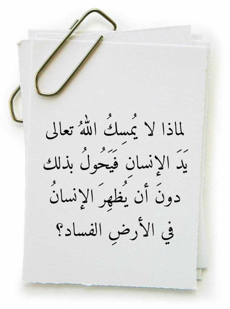 يُعينُ تدبُّرُ هذه الآيةِ الكريمة على الإجابةِ على سؤالِ “لماذا لا يُمسكُ اللهُ تعالى يدَ الإنسانِ فيحولُ بذلك دون أن يُظهرَ الإنسانُ في الأرضِ الفساد؟”. فهذه الآية ُالكريمة تُبيِّنُ لنا العلةَ من وراءِ إحجامِ اللهِ تعالى عن التدخُّلِ في “مسارِ أحداثِ الدنيا” وبما يتكفَّلُ بالحيلولةِ دون أن يُظهِرَ الإنسانُ في الأرضِ الفساد. فاللهُ تعالى إذ يُحجِمُ عن هذا التدخُّلِ فإنَّه إنما يريد أن يُتيحَ للإنسانِ فرصةً ليرى بأُمِّ عينَيه ما آلت إليه أمورُ دُنياه أما وقد أظهرَ في الإرضِ الفسادَ علَّ في ذلك أن يضطرَّه إلى العودةِ إلى جادةِ الصواب فيتَّبعَ هَديَ اللهِ تعالى من بعدِ إعراضِه عنه؛ هذا الإعراضُ الذي زيَّنَ له الجنوحَ إلى الفساد.