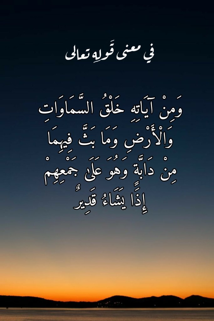 فاللهُ تعالى قد “بثَّ” إذاً دواباً في ستِ أرضين غيرَ أرضِنا هذه، وهو قادرٌ إن شاء على أن يجمعَ هذه الدوابَ كلَّها جميعاً في مكانٍ واحدٍ كأرضِنا هذه! ولنا أن نتصوَّرَ، وذلك على قدرِ ما تُمكِّنُنا منه عقولُنا المحدودةُ بما قُدِّرَ لها أن تُحيطَ به من علمٍ بهذا الوجود، ما يعنيهِ أن يكونَ بمقدورِ اللهِ تعالى أن “يجمعَ” دواباً بثَّها في سبعِ أرضين تفصلُ فيما بينها أبعادٌ لا قدرةَ لعقولِنا هذه على أن تقدِرَها حقَّ قدرِها.