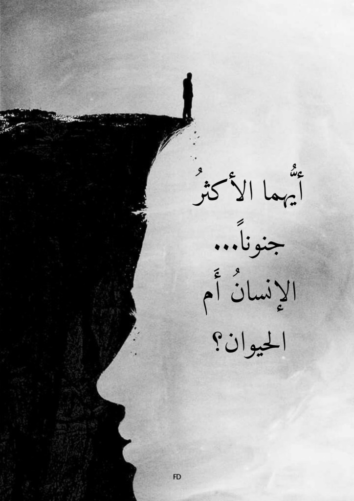 تتكفَّلُ الإجابةُ على سؤالِ “أيهما هو الأكثرُ التزاماً بنواميسِ اللهِ وقوانينِه: الحيوانُ أَم الإنسان؟” بالإجابةِ على سؤالٍ آخر مفادُه “أيهما الأكثرُ جنوناً: الإنسانُ أم الحيوان؟”. فأيُّ تقصيرٍ في الالتزامِ بنواميسِ اللهِ وقوانينِه يلزمُ عنه بالضرورة وجوبُ أن يعيشَ الكائنُ المُقصِّرُ “معيشةً ضَنكاً”. ومن تجلياتِ هذه “المعيشةِ الضنك” أن تتناوشَ الكائنَ المُقصِّرَ في الالتزامِ بنواميسِ اللهِ وقوانينِه من النوائبِ والمصائبِ ما ليس باليسيرِ إحصاؤه. ومن ذلك ما سوف ينتابُ عقلَه من لَوثاتٍ تجعلُهُ عُرضةً لِما بالإمكانِ وصفُه بأنَّهُ جنونٌ وخَبال، والجنونُ فنونٌ والخبالُ أشكال!