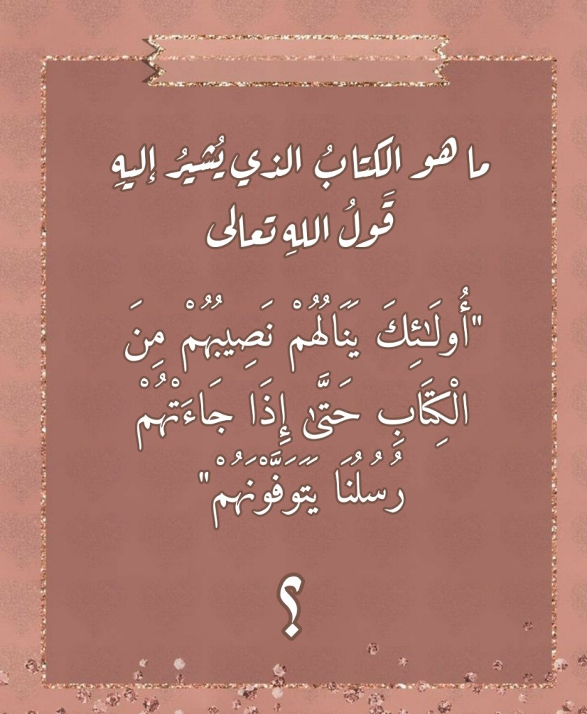 نقرأُ في سورةِ الأعراف، وفي الآية الكريمة 37 منها، قَولَ اللهِ تعالى: (فَمَنْ أَظْلَمُ مِمَّنِ افْتَرَى عَلَى اللَّهِ كَذِبًا أَوْ كَذَّبَ بِآيَاتِهِ أُولَئِكَ يَنَالُهُمْ نَصِيبُهُمْ مِنَ الْكِتَابِ حَتَّى إِذَا جَاءَتْهُمْ رُسُلُنَا يَتَوَفَّوْنَهُمْ قَالُوا أَيْنَ مَا كُنْتُمْ تَدْعُونَ مِنْ دُونِ اللَّهِ قَالُوا ضَلُّوا عَنَّا وَشَهِدُوا عَلَى أَنْفُسِهِمْ أَنَّهُمْ كَانُوا كَافِرِينَ). فما هو هذا “الكتاب” الذي تشيرُ إليه هذه الآيةُ الكريمة؟