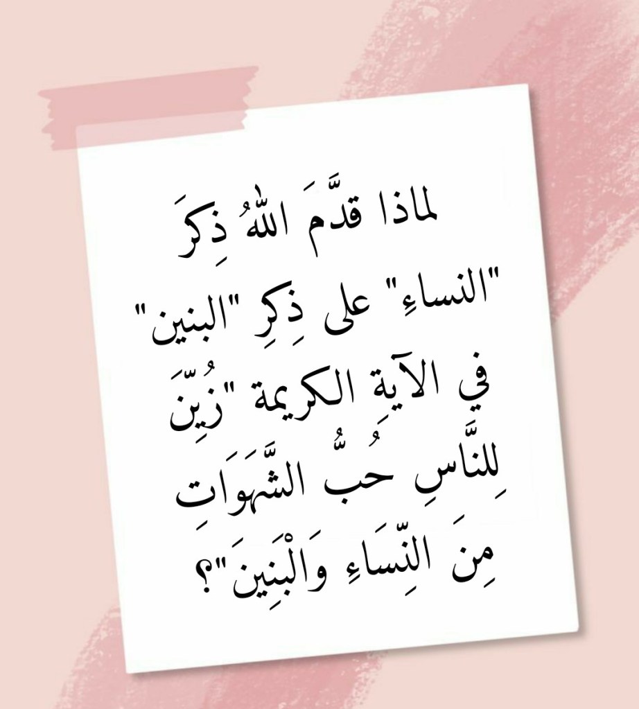 نوفمبر 13, 2022نوفمبر 13, 2022 Sufism24/7 لماذا قدَّمَ اللهُ ذِكرَ “النساءِ” على ذِكرِ “البنين” في الآيةِ الكريمة “زُيِّنَ لِلنَّاسِ حُبُّ الشَّهَوَاتِ مِنَ النِّسَاءِ وَالْبَنِينَ”؟ شارك هذا الموضوع: النقر للمشاركة على X (فتح في نافذة جديدة) X انقر للمشاركة على فيسبوك (فتح في نافذة جديدة) فيس بوك إعجاب تحميل... مرتبط
