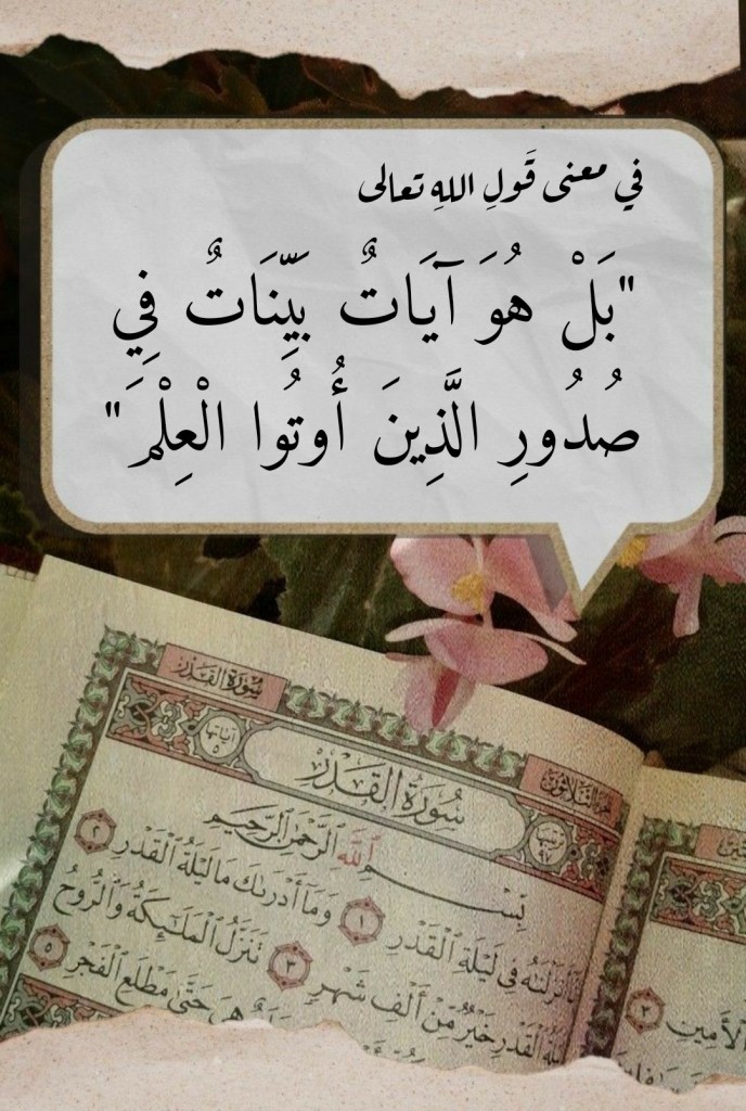نقرأُ في سورةِ العنكبوت، وفي الآيتَين الكريمتَين 48- 49 منها، قَولَ اللهِ تعالى: (وَمَا كُنْتَ تَتْلُو مِنْ قَبْلِهِ مِنْ كِتَابٍ وَلَا تَخُطُّهُ بِيَمِينِكَ إِذًا لَارْتَابَ الْمُبْطِلُونَ. بَلْ هُوَ آيَاتٌ بَيِّنَاتٌ فِي صُدُورِ الَّذِينَ أُوتُوا الْعِلْمَ وَمَا يَجْحَدُ بِآيَاتِنَا إِلَّا الظَّالِمُونَ). فما هو معنى “بَلْ هُوَ آيَاتٌ بَيِّنَاتٌ فِي صُدُورِ الَّذِينَ أُوتُوا الْعِلْمَ”؟
