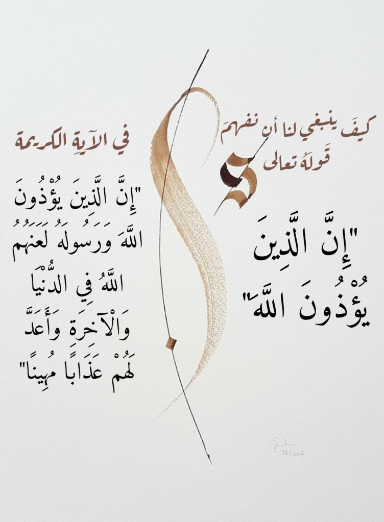 نقرأُ في سورةِ الأحزاب، وفي الآية الكريمة 57 منها، قَولَ اللهِ تعالى: (إِنَّ الَّذِينَ يُؤْذُونَ اللَّهَ وَرَسُولَهُ لَعَنَهُمُ اللَّهُ فِي الدُّنْيَا وَالْآخِرَةِ وَأَعَدَّ لَهُمْ عَذَابًا مُهِينًا). فكيف ينبغي لنا أن نفهم قوله تعالى “إِنَّ الَّذِينَ يُؤْذُونَ اللَّهَ” في هذه الآيةِ الكريمة؟