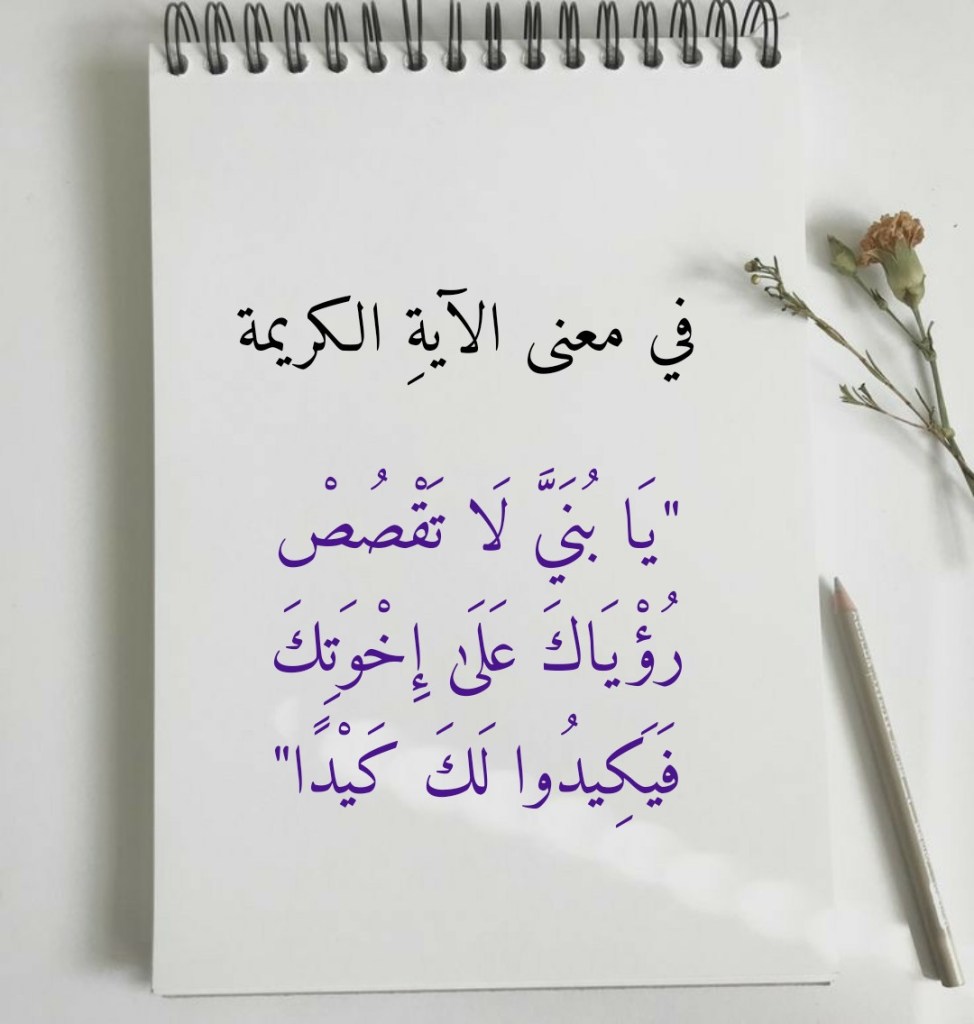 نقرأُ في سورةِ يوسف، وفي الآيةِ الكريمة 5 منها، قَولَ اللهِ تعالى: (قَالَ يَا بُنَيَّ لَا تَقْصُصْ رُؤْيَاكَ عَلَى إِخْوَتِكَ فَيَكِيدُوا لَكَ كَيْدًا إِنَّ الشَّيْطَانَ لِلْإِنْسَانِ عَدُوٌّ مُبِينٌ). فسيِّدُنا يعقوبُ وعظَ ابنَه يوسفَ بأن يكتمَ رؤياهُ فلا يُخبِرَ بها إخوتَه، وذلك مخافةَ أن يَطالَهُ بعضٌ مما كان يعتملُ في صدورِهم من حسدٍ له سوف تُفاقِمُه هذه الرؤيا لا محالة.