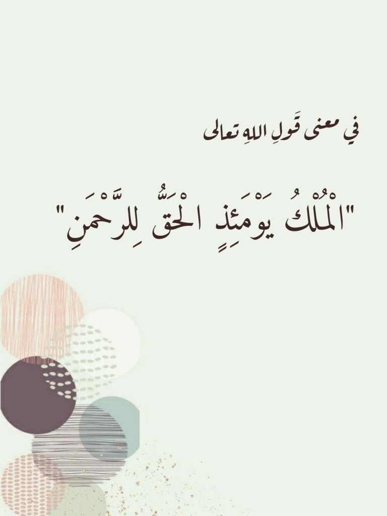 فاللهُ تعالى هو مالكُ المُلك، وهو الذي يؤتي مُلكَه مَن يشاءُ من عِبادِه في هذه الحياةِ الدنيا، فإذا جاءَ يومُ القيامة فلن يُؤتِيَ اللهُ تعالى فيه أحداً شيئاً من مُلكِهِ. ويومها سوف تنجلي الحقيقةُ ويتبيَّنُ لأولئك الذين توهَّموا الباطلَ حقاً في حياتِهم الدنيا أنَّ المالكَ الحقيقي هو اللهُ الذي لهُ المُلكُ على الحقيقة، وأنَّه هو مَن كان قد آتى المُلكَ في الحياةِ الدنيا لمَن شاءَ من عِبادِه. فاللهُ تعالى قد أقامَ هذه الحياةَ الدنيا على جملةٍ من “الأسبابِ” التي أجازَها بأن تفعلَ بإذنِهِ ما شاءَ لها أن تفعلَه إلى أجَلٍ مسمى، فإذا جاءَ هذا الأجلُ، وقامت الساعةُ، انتفى أيُّ وجودٍ لهذه “الأسباب” ولم يعُد هناك إلا يَدُ اللهِ تفعلُ ما تشاء. ولذلك وصفَ القرآنُ العظيم هذا المشهدَ بدلالةٍ من الكلماتِ القرآنيةِ التالية: “الْمُلْكُ يَوْمَئِذٍ الْحَقُّ لِلرَّحْمَنِ”.