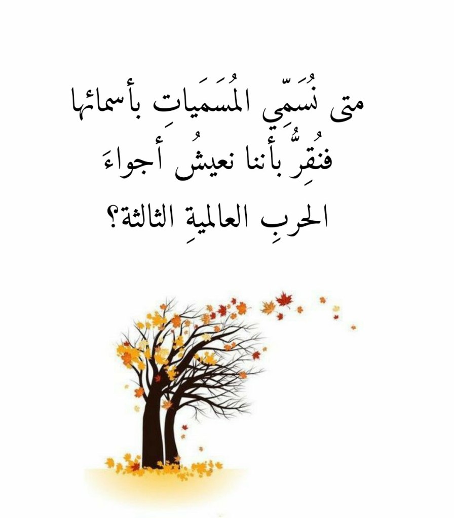 جانفي 11, 2023جانفي 11, 2023 Sufism24/7 متى نُسَمِّي المُسَمَياتِ بأسمائها فنُقِرُّ بأننا نعيشُ أجواءَ الحربِ العالميةِ الثالثة؟ شارك هذا الموضوع: النقر للمشاركة على X (فتح في نافذة جديدة) X انقر للمشاركة على فيسبوك (فتح في نافذة جديدة) فيس بوك إعجاب تحميل... مرتبط
