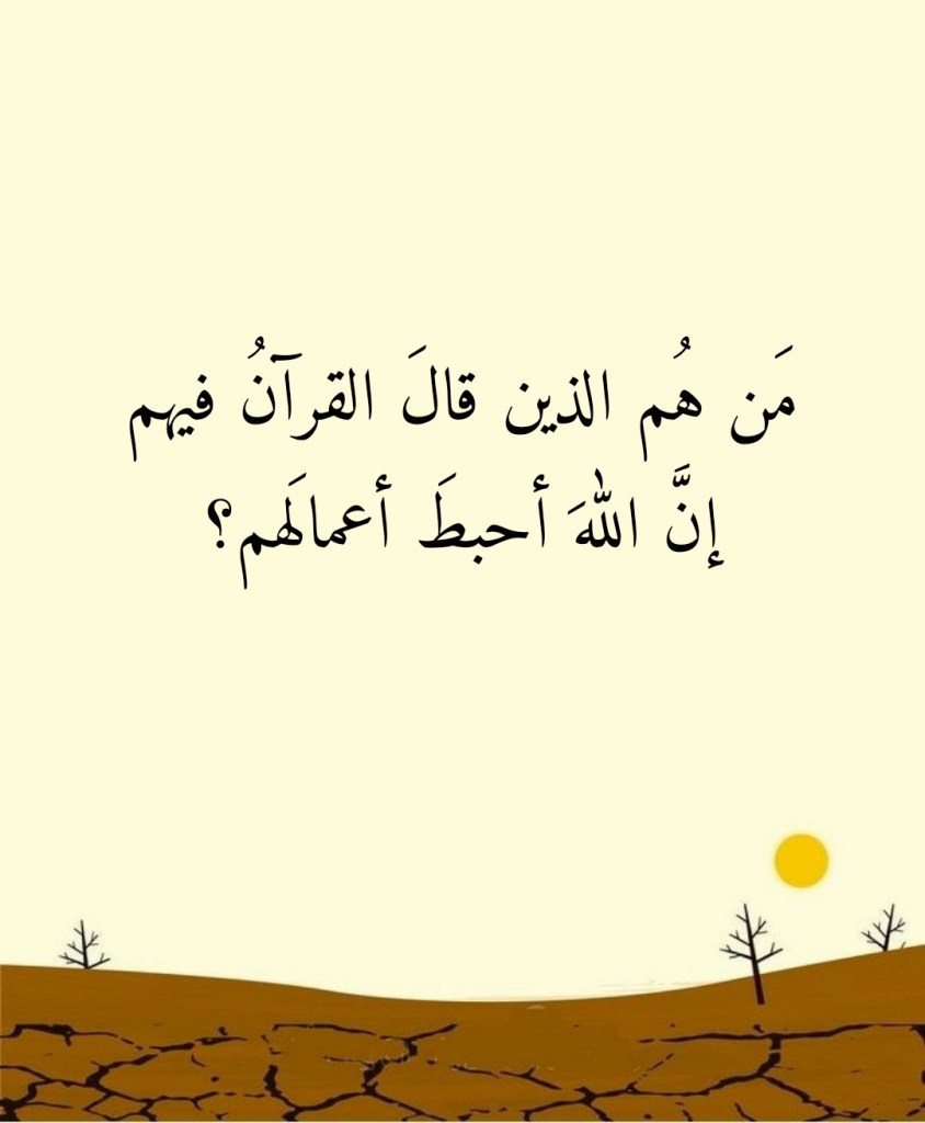 5- (قُلْ هَلْ نُنَبِّئُكُمْ بِالْأَخْسَرِينَ أَعْمَالًا. الَّذِينَ ضَلَّ سَعْيُهُمْ فِي الْحَيَاةِ الدُّنْيَا وَهُمْ يَحْسَبُونَ أَنَّهُمْ يُحْسِنُونَ صُنْعًا. أُولَئِكَ الَّذِينَ كَفَرُوا بِآيَاتِ رَبِّهِمْ وَلِقَائِهِ فَحَبِطَتْ أَعْمَالُهُمْ فَلَا نُقِيمُ لَهُمْ يَوْمَ الْقِيَامَةِ وَزْنًا) (103- 105 الكهف).