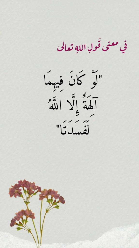 يُعينُ على تبيُّنِ هذا المعنى أن نتدبَّرَ قولَ اللهِ تعالى في الآيةِ الكريمة 71 من سورةِ المؤمنون: (وَلَوِ اتَّبَعَ الْحَقُّ أَهْوَاءهُمْ لَفَسَدَتِ السَّمَاوَاتُ وَالْأَرْضُ وَمَن فِيهِنَّ). فتدبُّرُ قولِ اللهِ تعالى هذا يُبيِّنُ لنا أنَّ قيامَ السمواتِ والأرضِ هو برهانُ فسادِ وبطلانِ زعمِ المشركين بأنَّ مع اللهِ آلهةً أخرى، وهو ذات المعنى الذي يُبيِّنُه لنا تدبُّرُ قولِ اللهِ تعالى “لَوْ كَانَ فِيهِمَا آلِهَةٌ إِلَّا اللَّهُ لَفَسَدَتَا”.