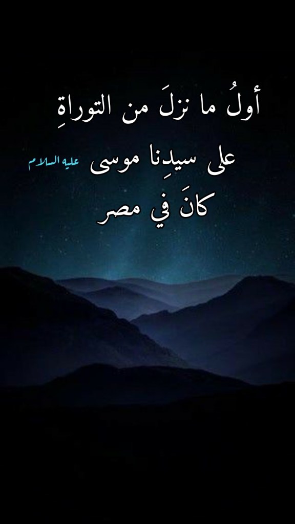 وأولُ ما نزلَ من التوراة كان في مصرَ بعد أن اشتدَّ عُودُ سيدِنا موسى وأصبحَ أهلاً لأن يتلقَّى عن اللهِ تعالى أُولى كلماتِ هذا الكتابِ المبارك: (وَلَمَّا بَلَغَ أَشُدَّهُ وَاسْتَوَى آتَيْنَاهُ حُكْمًا وَعِلْمًا وَكَذَلِكَ نَجْزِي الْمُحْسِنِينَ) (14 القصص).