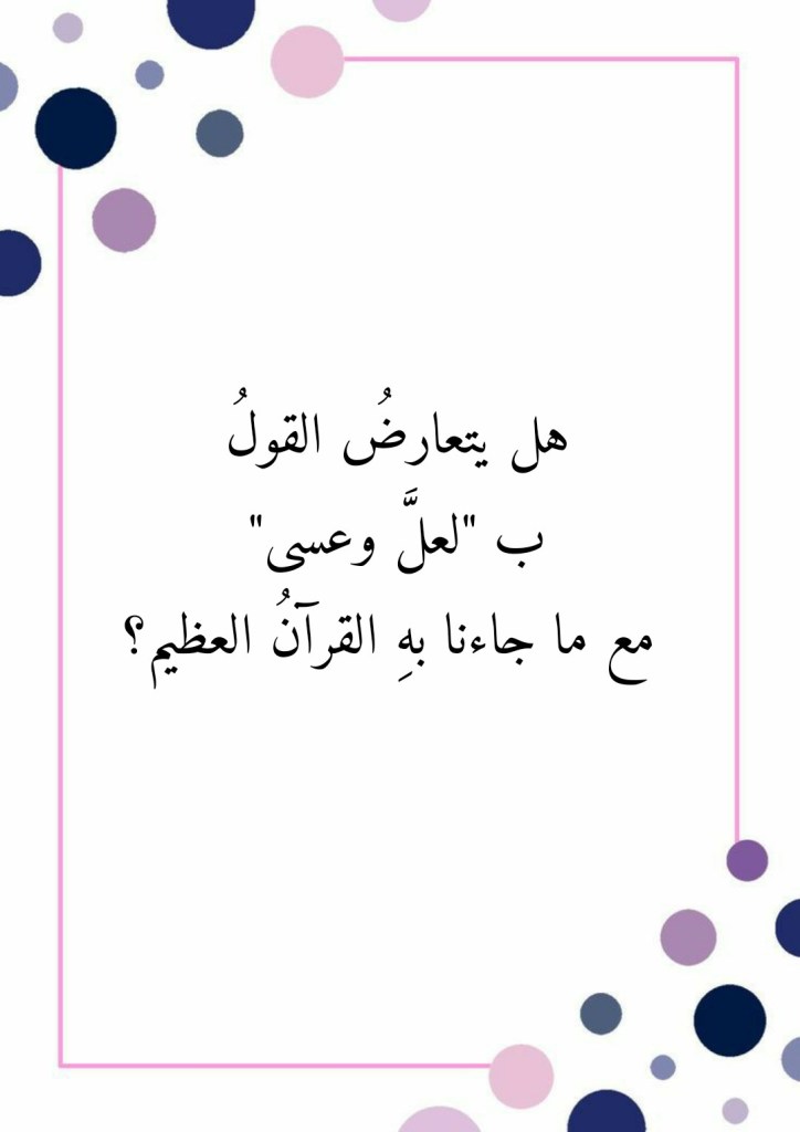 ومن ذلك عبارةُ “لعلَّ وعسى”. فهذه العبارةُ يعودُ أصلُها إلى مَن جعلَه حالُه مع اللهِ تعالى يوقِنُ بأنَّ اللهَ قادرٌ على أن يفعلَ ما يشاء أنَّى يشاء، وأنَّه هو وحدَه مَن بمقدورِه أن يقولَ للشيءِ إذا أرادَه “كُن فيكون”. ومَن كان هذا هو حالُه مع اللهِ تعالى لا ينبغي أن يُستغربَ منه القولُ بـ “لعلَّ وعسى”، خصوصاً إذا ما تذكَّرنا أنَّ أصلَ “لعلَّ وعسى” هو “لعلَّ اللهَ” و”عسى اللهُ”. فكيف نريدُ مَن كان هذا هو حالَه مع اللهِ تعالى، إيقاناً بقدرةِ اللهِ المطلقة وتصديقاً بأنَّ الأمرَ كلَّه لله، ألا يقولَ “لعلَّ اللهَ” و”عسى اللهُ” وهو يقرأُ في القرآنِ العظيم: