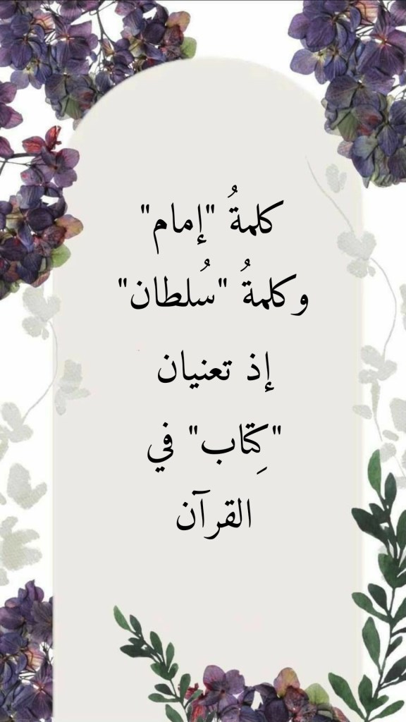 وتردُ كلمةُ “إمام” في القرآنِ العظيم بمعان عدة. ومن هذه المعاني “كتاب”، وذلك كما في قولِ اللهِ تعالى: (إِنَّا نَحْنُ نُحْيِي الْمَوْتَى وَنَكْتُبُ مَا قَدَّمُوا وَآثَارَهُمْ وَكُلَّ شَيْءٍ أحْصَيْنَاهُ فِي إِمَامٍ مُبِين) (12 يس). فهذا “الإمامُ المبين” هو الكتابُ الذي أحصى اللهُ تعالى فيه كلَّ شيء، وذلك مصداقَ قولِه تعالى: (وَكُلَّ شَيْءٍ أَحْصَيْنَاهُ كِتَابًا) (29 النبأ).