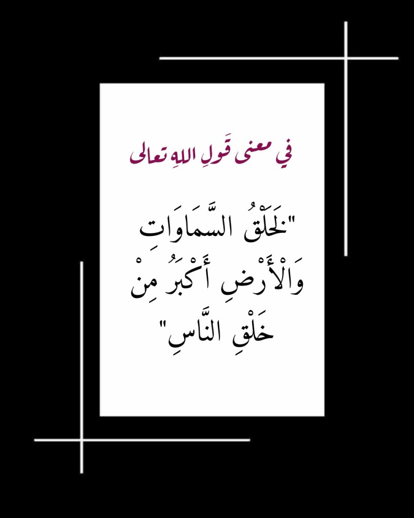 نقرأُ في سورةِ غافر، وفي الآيةِ الكريمة 57 منها، قولَ اللهِ تعالى: (لَخَلْقُ السَّمَاوَاتِ وَالْأَرْضِ أَكْبَرُ مِنْ خَلْقِ النَّاسِ وَلَكِنَّ أَكْثَرَ النَّاسِ لَا يَعْلَمُونَ). فما هو معنى “لَخَلْقُ السَّمَاوَاتِ وَالْأَرْضِ أَكْبَرُ مِنْ خَلْقِ النَّاسِ”؟