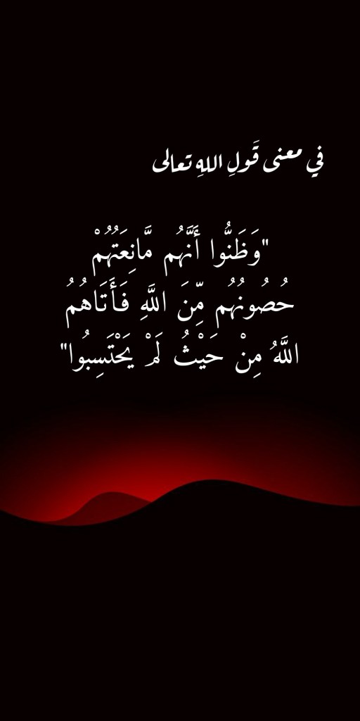نقرأُ في سورةِ الحشر، وفي الآيةِ الكريمة 2 منها، قولَ اللهِ تعالى: (هُوَ الَّذِي أَخْرَجَ الَّذِينَ كَفَرُوا مِنْ أَهْلِ الْكِتَابِ مِنْ دِيَارِهِمْ لِأَوَّلِ الْحَشْرِ مَا ظَنَنْتُمْ أَنْ يَخْرُجُوا وَظَنُّوا أَنَّهُمْ مَانِعَتُهُمْ حُصُونُهُمْ مِنَ اللَّهِ فَأَتَاهُمُ اللَّهُ مِنْ حَيْثُ لَمْ يَحْتَسِبُوا وَقَذَفَ فِي قُلُوبِهِمُ الرُّعْبَ يُخْرِبُونَ بُيُوتَهُمْ بِأَيْدِيهِمْ وَأَيْدِي الْمُؤْمِنِينَ فَاعْتَبِرُوا يَا أُولِي الْأَبْصَار). فما هو معنى “وَظَنُّوا أَنَّهُمْ مَانِعَتُهُمْ حُصُونُهُمْ مِنَ اللَّهِ فَأَتَاهُمُ اللَّهُ مِنْ حَيْثُ لَمْ يَحْتَسِبُوا” في هذه الآيةِ الكريمة؟
