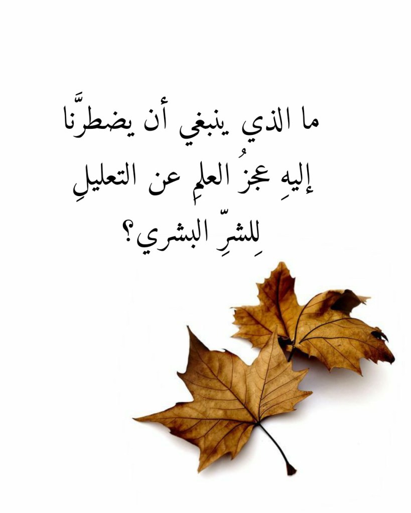 إنَّ عجزَ العلمِ عن التعليلِ للشرِّ البشري ينبغي أن يضطرَّنا إلى الأخذِ بما يقولُ به الدينُ بهذا الشأن، حتى وإن جعلنا ذلك نتخلى عن كثيرٍ من المسَلَّماتِ و”البديهيات” التي هي في حقيقةِ الأمرِ ليست كذلك!