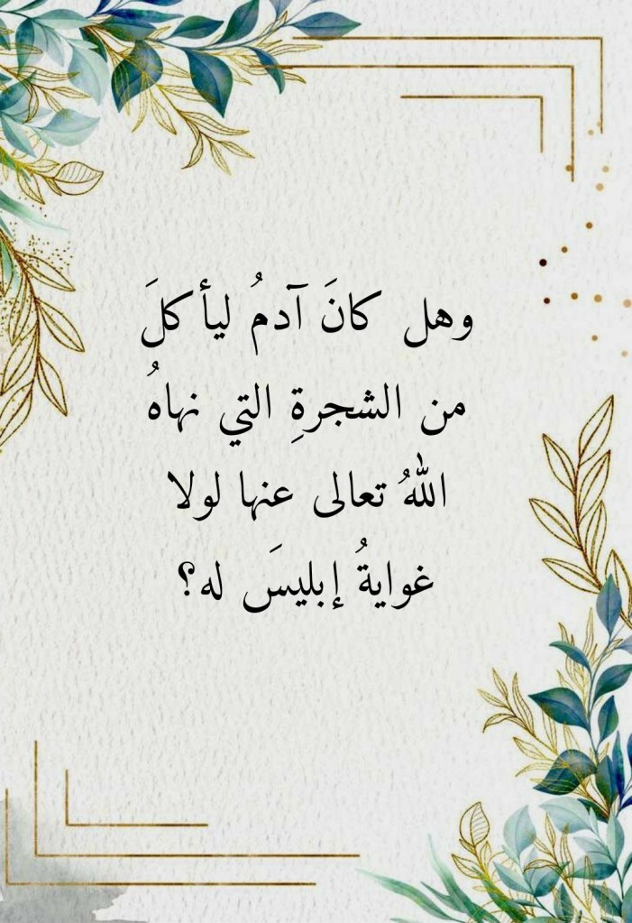 أسكنَ اللهُ تعالى آدمَ وزوجَه الجنةَ وأمرَهما بألا يقربا شجرةً بِعَينِها عرَّفها لهما: (وَيَا آدَمُ اسْكُنْ أَنْتَ وَزَوْجُكَ الْجَنَّةَ فَكُلَا مِنْ حَيْثُ شِئْتُمَا وَلَا تَقْرَبَا هَذِهِ الشَّجَرَةَ فَتَكُونَا مِنَ الظَّالِمِين) (19 الأعراف). فهل كان آدمُ ليأكلَ من الشجرةِ التي نهاهُ اللهُ تعالى عنها لولا غوايةُ إبليسَ له؟