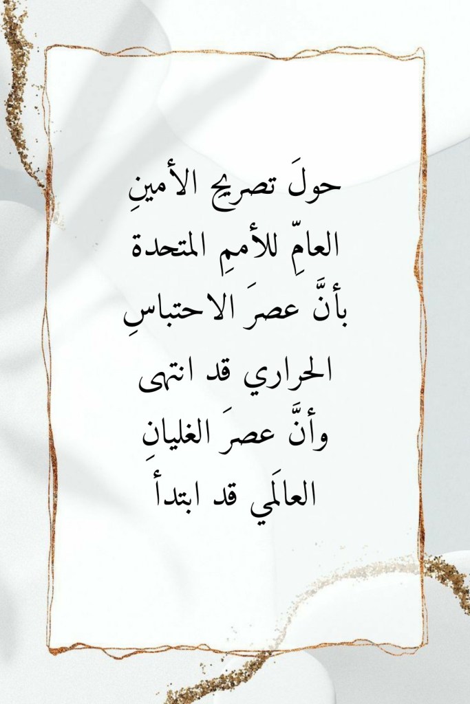 جويلية 27, 2023جويلية 27, 2023 Sufism24/7 حولَ تصريحِ الأمينِ العامِّ للأممِ المتحدة بأنَّ عصرَ الاحتباسِ الحراري قد انتهى وأنَّ عصرَ الغليانِ العالَمي قد ابتدأ شارك هذا الموضوع: النقر للمشاركة على X (فتح في نافذة جديدة) X انقر للمشاركة على فيسبوك (فتح في نافذة جديدة) فيس بوك إعجاب تحميل... مرتبط