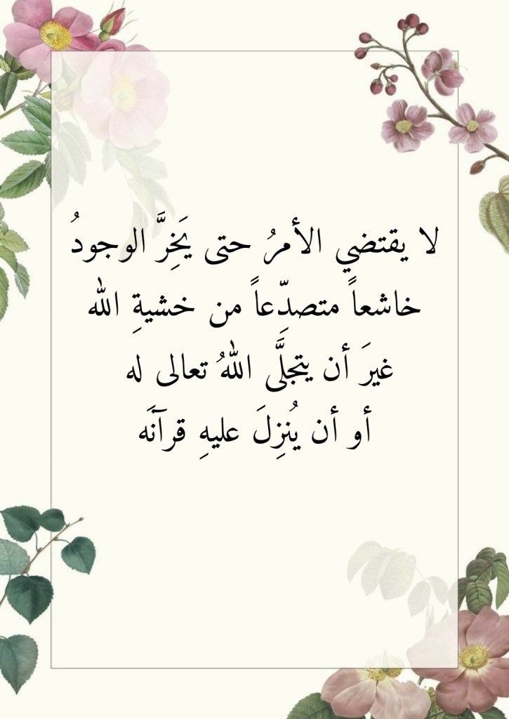 جويلية 28, 2023 Sufism24/7 لا يقتضي الأمرُ حتى يَخِرَّ الوجودُ خاشعاً متصدِّعاً من خشيةِ الله غيرَ أن يتجلَّى اللهُ تعالى له أو أن يُنزِلَ عليهِ قرآنَه شارك هذا الموضوع: النقر للمشاركة على X (فتح في نافذة جديدة) X انقر للمشاركة على فيسبوك (فتح في نافذة جديدة) فيس بوك إعجاب تحميل... مرتبط