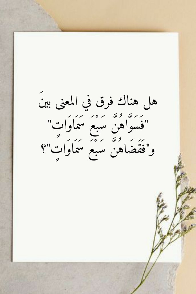 فالعبارةُ القرآنية “فَسَوَّاهُنَّ سَبْعَ سَمَاوَاتٍ” تحملُ ذاتَ المعنى الذي تنطوي عليه العبارةُ القرآنية “فَقَضَاهُنَّ سَبْعَ سَمَاوَاتٍ”. وكلُّ زعمٍ بأن هنالك تبايناً في المعنى بين هاتين العبارتَين القرآنيتَين الجليلتَين ما هو إلا تحكيمٌ لمنطقِ عقلِنا البشري في كلامِ اللهِ تعالى الذي لن نقدرَه حقَّ قدرِه إلا من بعدِ أن نُقِرَّ بأنَّ منطقَه الإلهي ليس له بالضرورة أن يتطابقَ ويتماهى مع منطقِ عقلِنا البشري.