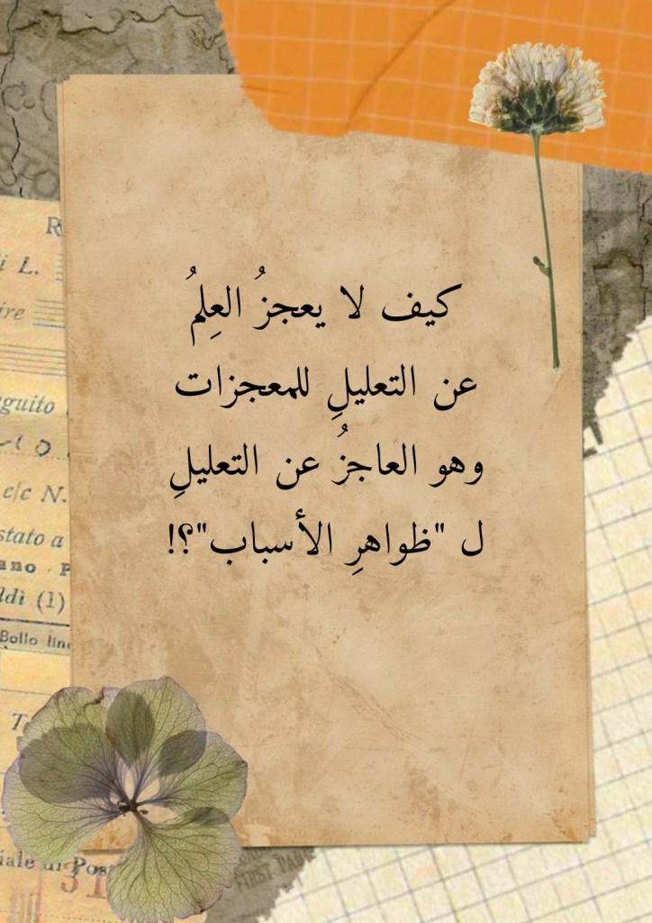 أوت 4, 2023أوت 4, 2023 Sufism24/7 كيف لا يعجزُ العِلمُ عن التعليلِ للمعجزات وهو العاجزُ عن التعليلِ ل “ظواهرِ الأسباب”؟! شارك هذا الموضوع: النقر للمشاركة على X (فتح في نافذة جديدة) X انقر للمشاركة على فيسبوك (فتح في نافذة جديدة) فيس بوك إعجاب تحميل... مرتبط