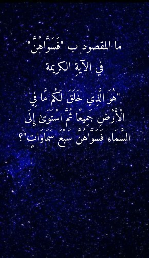 نقرأُ في سورةِ البقرة، وفي الآيةِ الكريمة 29 منها، قولَ اللهِ تعالى: (هُوَ الَّذِي خَلَقَ لَكُمْ مَا فِي الْأَرْضِ جَمِيعًا ثُمَّ اسْتَوَى إِلَى السَّمَاءِ فَسَوَّاهُنَّ سَبْعَ سَمَاوَاتٍ وَهُوَ بِكُلِّ شَيْءٍ عَلِيمٌ). فما هو المقصود بـ “فَسَوَّاهُنَّ” في هذه الآيةِ الكريمة؟