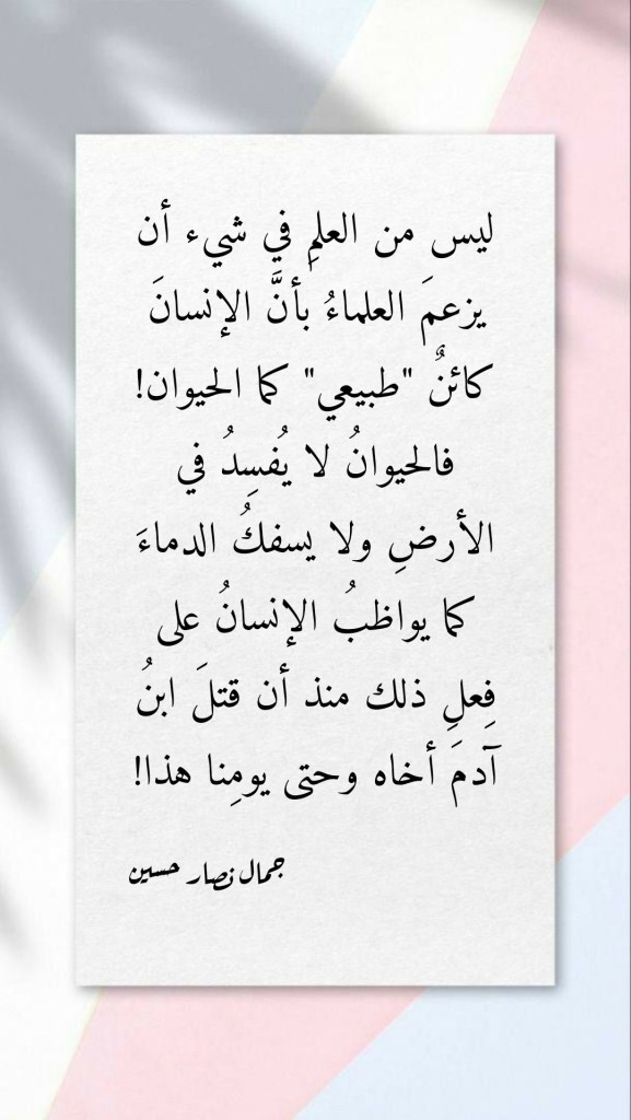 أوت 6, 2023أوت 6, 2023 Sufism24/7 هل من العلمِ في شيء أن يزعمَ العلماءُ بأنَّ الإنسانَ كائنٌ “طبيعي” كما الحيوان؟ شارك هذا الموضوع: النقر للمشاركة على X (فتح في نافذة جديدة) X انقر للمشاركة على فيسبوك (فتح في نافذة جديدة) فيس بوك إعجاب تحميل... مرتبط