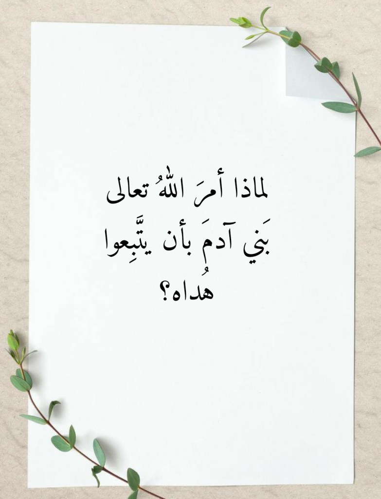 نقرأُ في سورةِ البقرة، وفي الآيتَين الكريمتَين 38- 39 منها، قولَ اللهِ تعالى: (قُلْنَا اهْبِطُوا مِنْهَا جَمِيعًا فَإِمَّا يَأْتِيَنَّكُمْ مِنِّي هُدًى فَمَنْ تَبِعَ هُدَايَ فَلَا خَوْفٌ عَلَيْهِمْ وَلَا هُمْ يَحْزَنُونَ. وَالَّذِينَ كَفَرُوا وَكَذَّبُوا بِآيَاتِنَا أُولَئِكَ أَصْحَابُ النَّارِ هُمْ فِيهَا خَالِدُونَ). فلماذا أمرَ اللهُ تعالى بَني آدمَ بأن يتبعوا هداه؟