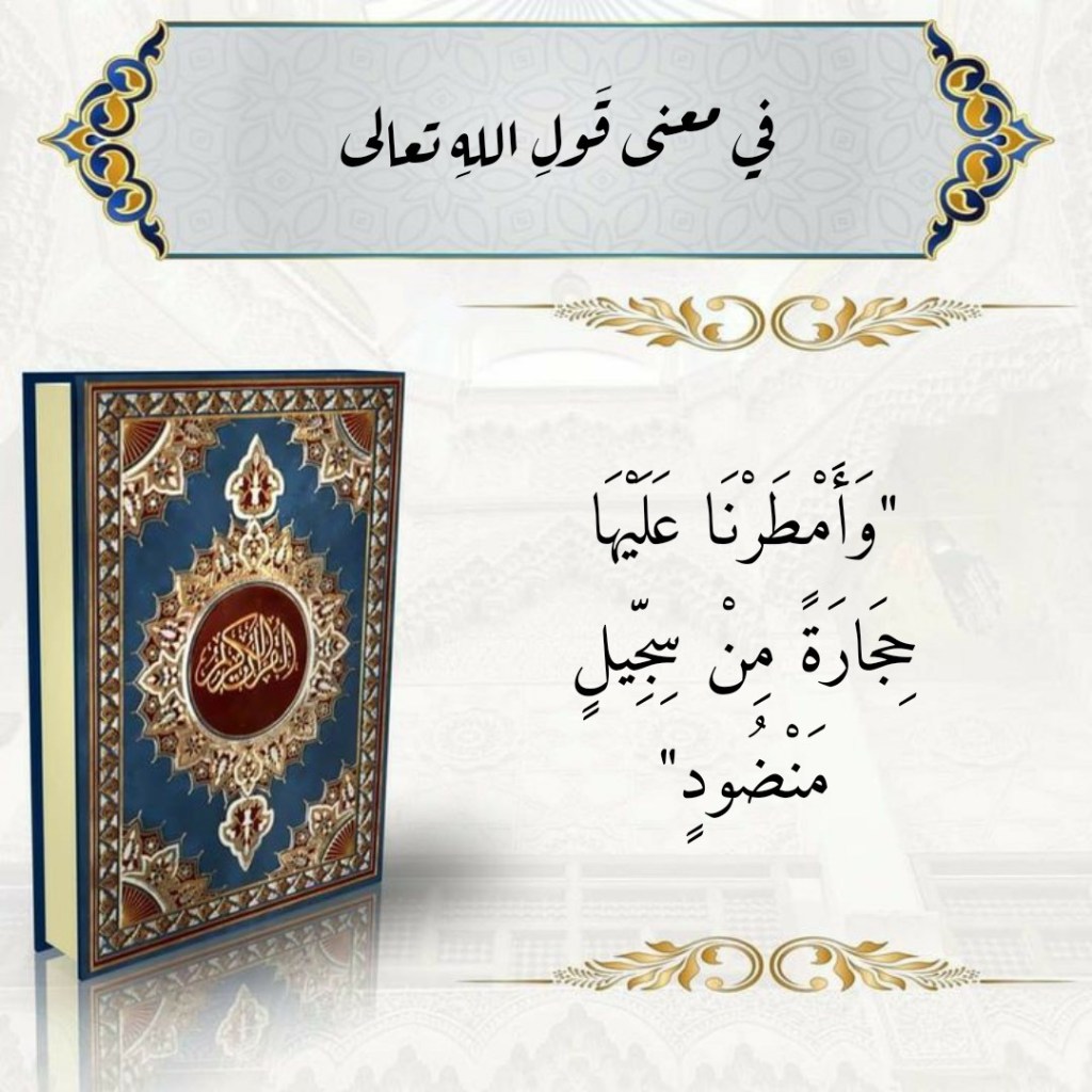 أوت 21, 2023أوت 21, 2023 Sufism24/7 في معنى قولِ اللهِ تعالى “وَأَمْطَرْنَا عَلَيْهَا حِجَارَةً مِنْ سِجِّيلٍ مَنْضُودٍ” شارك هذا الموضوع: النقر للمشاركة على X (فتح في نافذة جديدة) X انقر للمشاركة على فيسبوك (فتح في نافذة جديدة) فيس بوك إعجاب تحميل... مرتبط
