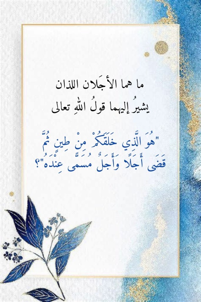 نقرأُ في سورةِ الأنعام، وفي الآيةِ الكريمة 2 منها، قَولَ اللهِ تعالى: (هُوَ الَّذِي خَلَقَكُمْ مِنْ طِينٍ ثُمَّ قَضَى أَجَلًا وَأَجَلٌ مُسَمًّى عِنْدَهُ ثُمَّ أَنْتُمْ تَمْتَرُون). فما هما هذان الأجلان اللذان يشيرُ إليهما قَولُ اللهِ تعالى هذا؟