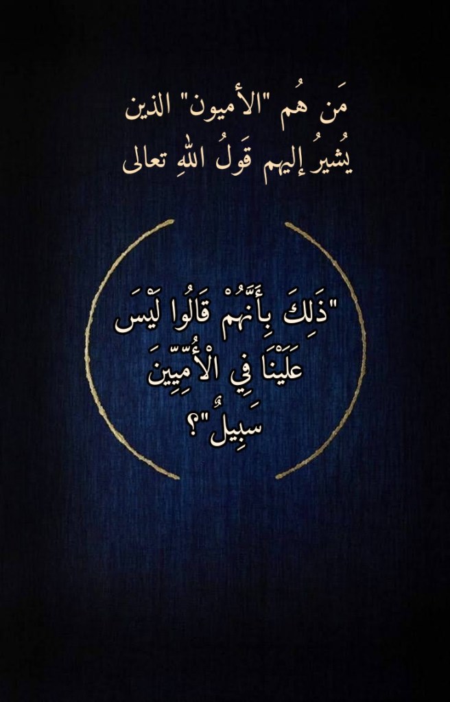 نقرأُ في سورةِ آل عِمران، وفي الآيةِ الكريمة 75 منها، قولَ اللهِ تعالى: (وَمِنْ أَهْلِ الْكِتَابِ مَنْ إِنْ تَأْمَنْهُ بِقِنْطَارٍ يُؤَدِّهِ إِلَيْكَ وَمِنْهُمْ مَنْ إِنْ تَأْمَنْهُ بِدِينَارٍ لَا يُؤَدِّهِ إِلَيْكَ إِلَّا مَا دُمْتَ عَلَيْهِ قَائِمًا ذَلِكَ بِأَنَّهُمْ قَالُوا لَيْسَ عَلَيْنَا فِي الْأُمِّيِّينَ سَبِيلٌ وَيَقُولُونَ عَلَى اللَّهِ الْكَذِبَ وَهُمْ يَعْلَمُون). فمَن هُم “الأميون” الذين تشيرُ إليهم هذه الآيةُ الكريمة؟
