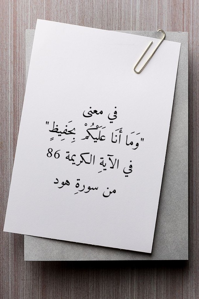 نقرأُ في سورةِ هود، وفي الآيتَين الكريمتَين 85- 86 منها، قولَ اللهِ تعالى: (وَيَا قَوْمِ أَوْفُوا الْمِكْيَالَ وَالْمِيزَانَ بِالْقِسْطِ وَلَا تَبْخَسُوا النَّاسَ أَشْيَاءَهُمْ وَلَا تَعْثَوْا فِي الْأَرْضِ مُفْسِدِينَ. بَقِيَّةُ اللَّهِ خَيْرٌ لَكُمْ إِنْ كُنْتُمْ مُؤْمِنِينَ وَمَا أَنَا عَلَيْكُمْ بِحَفِيظٍ). فما هو معنى “وَمَا أَنَا عَلَيْكُمْ بِحَفِيظٍ”؟