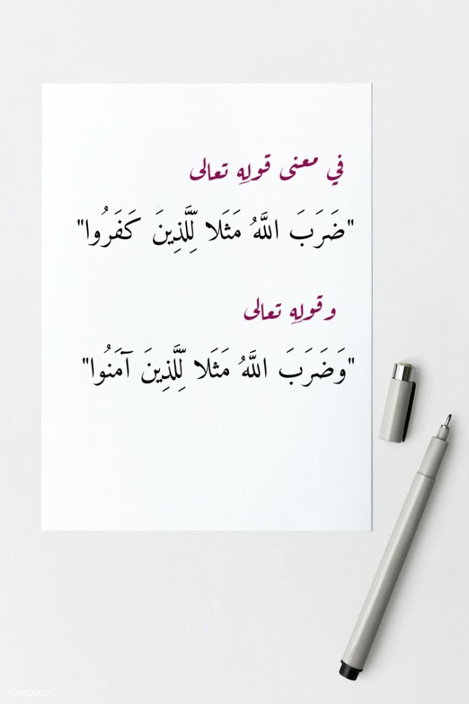 كما ونقرأُ في سورةِ التحريم أيضاً، وفي الآيتَين الكريمتَين 11- 12 منها، قولَ اللهِ تعالى: (وَضَرَبَ اللَّهُ مَثَلًا لِلَّذِينَ آمَنُوا اِمْرَأَةَ فِرْعَوْنَ إِذْ قَالَتْ رَبِّ ابْنِ لِي عِنْدَكَ بَيْتًا فِي الْجَنَّةِ وَنَجِّنِي مِنْ فِرْعَوْنَ وَعَمَلِهِ وَنَجِّنِي مِنَ الْقَوْمِ الظَّالِمِينَ. وَمَرْيَمَ ابْنَتَ عِمْرَانَ الَّتِي أَحْصَنَتْ فَرْجَهَا فَنَفَخْنَا فِيهِ مِنْ رُوحِنَا وَصَدَّقَتْ بِكَلِمَاتِ رَبِّهَا وَكُتُبِهِ وَكَانَتْ مِنَ الْقَانِتِينَ). فما هو معنى “وَضَرَبَ اللَّهُ مَثَلًا لِلَّذِينَ آمَنُوا” في قولِ اللهِ تعالى هذا؟