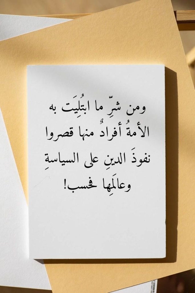 أكتوبر 16, 2023أكتوبر 16, 2023 Sufism24/7 ومن شرِّ ما ابتُلِيَت به الأمةُ أفرادٌ منها قصروا نفوذَ الدينِ على السياسةِ وعالَمِها فحسب! شارك هذا الموضوع: النقر للمشاركة على X (فتح في نافذة جديدة) X انقر للمشاركة على فيسبوك (فتح في نافذة جديدة) فيس بوك إعجاب تحميل... مرتبط