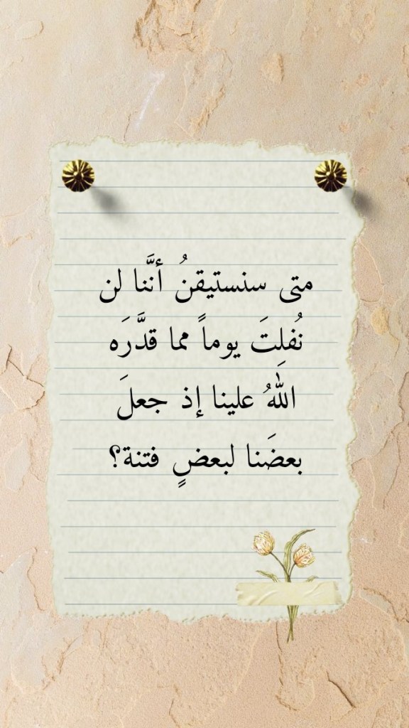 أكتوبر 25, 2023أكتوبر 25, 2023 Sufism24/7 متى سنستيقنُ أنَّنا لن نُفلِتَ يوماً مما قدَّرَه اللهُ علينا إذ جعلَ بعضَنا لبعضٍ فتنة؟ شارك هذا الموضوع: النقر للمشاركة على X (فتح في نافذة جديدة) X انقر للمشاركة على فيسبوك (فتح في نافذة جديدة) فيس بوك إعجاب تحميل... مرتبط