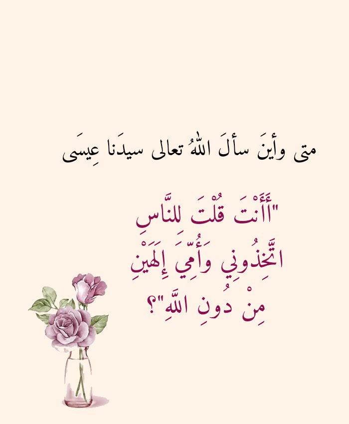 نقرأُ في سورةِ المائدة، وفي الآيتَين الكريمتَين 116- 117 منها، قولَ اللهِ تعالى: (وَإِذْ قَالَ اللَّهُ يَا عِيسَى ابْنَ مَرْيَمَ أَأَنْتَ قُلْتَ لِلنَّاسِ اتَّخِذُونِي وَأُمِّيَ إِلَهَيْنِ مِنْ دُونِ اللَّهِ قَالَ سُبْحَانَكَ مَا يَكُونُ لِي أَنْ أَقُولَ مَا لَيْسَ لِي بِحَقٍّ إِنْ كُنْتُ قُلْتُهُ فَقَدْ عَلِمْتَهُ تَعْلَمُ مَا فِي نَفْسِي وَلَا أَعْلَمُ مَا فِي نَفْسِكَ إِنَّكَ أَنْتَ عَلَّامُ الْغُيُوبِ. مَا قُلْتُ لَهُمْ إِلَّا مَا أَمَرْتَنِي بِهِ أَنِ اعْبُدُوا اللَّهَ رَبِّي وَرَبَّكُمْ وَكُنْتُ عَلَيْهِمْ شَهِيدًا مَا دُمْتُ فِيهِمْ فَلَمَّا تَوَفَّيْتَنِي كُنْتَ أَنْتَ الرَّقِيبَ عَلَيْهِمْ وَأَنْتَ عَلَى كُلِّ شَيْءٍ شَهِيدٌ). فمتى وأينَ سألَ اللهُ تعالى سيدَنا عيسى “أَأَنْتَ قُلْتَ لِلنَّاسِ اتَّخِذُونِي وَأُمِّيَ إِلَهَيْنِ مِنْ دُونِ اللَّهِ”؟