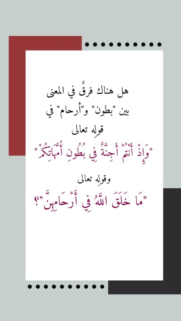 هل هناك فرقٌ في المعنيتبيَّنُ لنا، وبتدبُّرِ مواطنِ ورود كلمةِ “أرحام” وكلمةِ “بطون” في القرآنِ العظيم، أنَّ هنالك فرقاً بين هاتين الكلمتَين القرآنيتَين بوسعنا أن نحيطَ به بتدبُّرِنا بعضاً من هذه المواطن:
