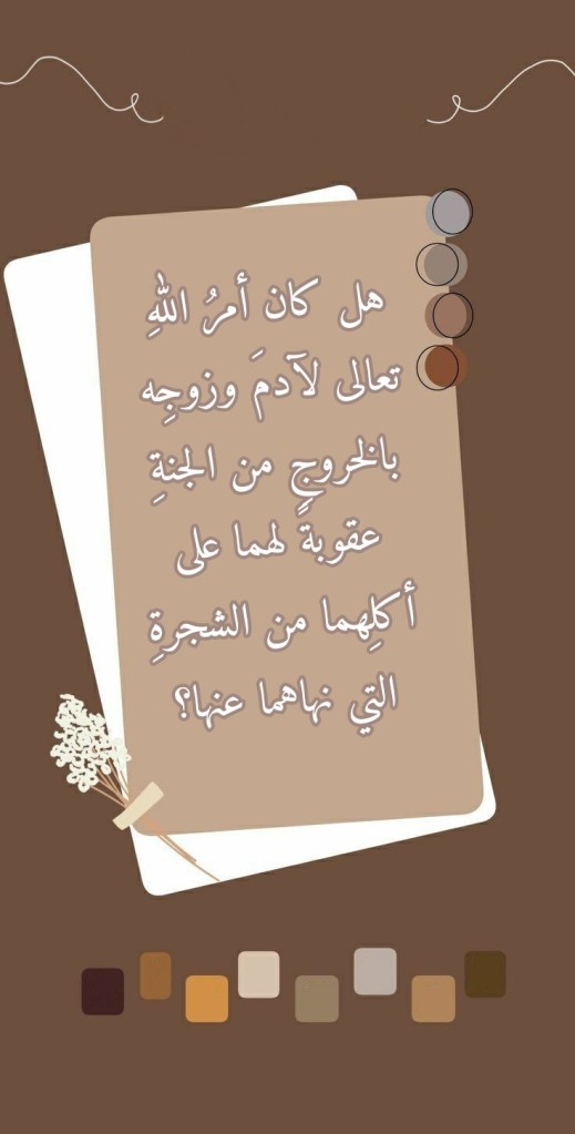أمرَ اللهُ تعالى آدمَ وزوجَه بأن يخرجا من الجنةِ التي كان قد آواهما إليها، وذلك من بعدِ أكلِهما من الشجرةِ التي نهاهما عنها: (وَقُلْنَا يَا آدَمُ اسْكُنْ أَنْتَ وَزَوْجُكَ الْجَنَّةَ وَكُلَا مِنْهَا رَغَدًا حَيْثُ شِئْتُمَا وَلَا تَقْرَبَا هَذِهِ الشَّجَرَةَ فَتَكُونَا مِنَ الظَّالِمِينَ. فَأَزَلَّهُمَا الشَّيْطَانُ عَنْهَا فَأَخْرَجَهُمَا مِمَّا كَانَا فِيهِ وَقُلْنَا اهْبِطُوا بَعْضُكُمْ لِبَعْضٍ عَدُوٌّ وَلَكُمْ فِي الْأَرْضِ مُسْتَقَرٌّ وَمَتَاعٌ إِلَى حِينٍ) (35- 36 البقرة). فهل كان أمرُ اللهِ تعالى لآدمَ وزوجِه بالخروجِ من الجنةِ عقوبةً لهما على أكلِهما من تلك الشجرةِ؟