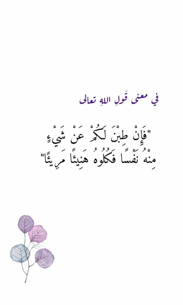 نقرأُ في سورةِ النساء، وفي الآيةِ الكريمةِ 4 منها، قولَ اللهِ تعالى: (وَآتُوا النِّسَاءَ صَدُقَاتِهِنَّ نِحْلَةً فَإِنْ طِبْنَ لَكُمْ عَنْ شَيْءٍ مِنْهُ نَفْسًا فَكُلُوهُ هَنِيئًا مَرِيئًا).