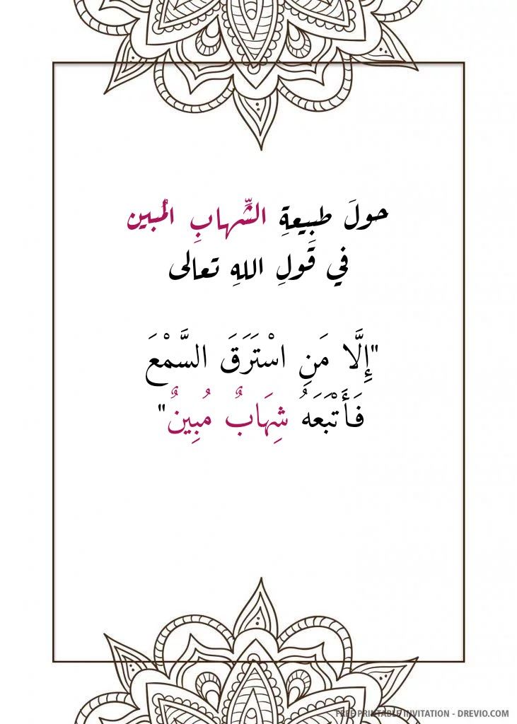 1- (إِنَّا زَيَّنَّا السَّمَاءَ الدُّنْيَا بِزِينَةٍ الْكَوَاكِبِ. وَحِفْظًا مِنْ كُلِّ شَيْطَانٍ مَارِدٍ. لَا يَسَّمَّعُونَ إِلَى الْمَلَإِ الْأَعْلَى وَيُقْذَفُونَ مِنْ كُلِّ جَانِبٍ. دُحُورًا وَلَهُمْ عَذَابٌ وَاصِبٌ. إِلَّا مَنْ خَطِفَ الْخَطْفَةَ فَأَتْبَعَهُ شِهَابٌ ثَاقِبٌ) (6- 10 الصافات).