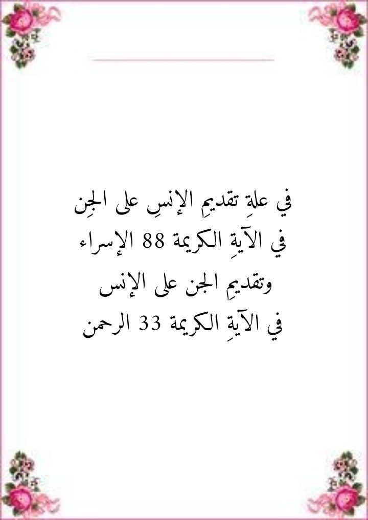 قدَّمَ اللهُ تعالى ذِكرَ الإنسِ على ذِكرِ الجن في قولِه: (قُلْ لَئِنِ اجْتَمَعَتِ الْإِنْسُ وَالْجِنُّ عَلَى أَنْ يَأْتُوا بِمِثْلِ هَذَا الْقُرْآنِ لَا يَأْتُونَ بِمِثْلِهِ وَلَوْ كَانَ بَعْضُهُمْ لِبَعْضٍ ظَهِيرًا) (88 الإسراء). وفي هذا التقديمِ ما فيه من تذكيرٍ بالحقيقةِ القرآنيةِ التي مفادُها أنَّ اللهَ تعالى اختصَّ بَني آدمَ بقرآنِه اختصاصاً لم يحُل دون أن يكونَ بمقدورِ الجن أن يتدبَّروا نصَّه الكريم إذا ما يسَّرَ لمن يشاءُ منهم أمرَ ذلك. فاللهُ تعالى هو الذي صرفَ إلى رسولِه الكريم صلَّى اللهُ تعالى عليه وسلَّم نفراً من الجنِّ يستمعون القرآن: (وَإِذْ صَرَفْنَا إِلَيْكَ نَفَرًا مِنَ الْجِنِّ يَسْتَمِعُونَ الْقُرْآنَ فَلَمَّا حَضَرُوهُ قَالُوا أَنْصِتُوا فَلَمَّا قُضِيَ وَلَّوْا إِلَى قَوْمِهِمْ مُنْذِرِينَ) (29 الأحقاف)، (قُلْ أُوحِيَ إِلَيَّ أَنَّهُ اسْتَمَعَ نَفَرٌ مِنَ الْجِنِّ فَقَالُوا إِنَّا سَمِعْنَا قُرْآنًا عَجَبًا) (1 الجن).